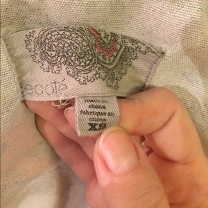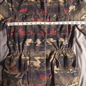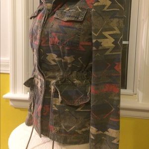 This fitted light-weight jacket has a beautiful Aztec-style print. The collar can be worn up in a funnel or folded over, it buttons all the way down, and has a cinch-cord on both sides to give it a custom-fitted look, very flattering. Two flap pockets at the breast, two at the hips, and snaps on cuff. Excellent condition, fabric is soft, 100% cotton twill. Fits true to size. By Ecoté label from urban outfitters.