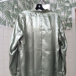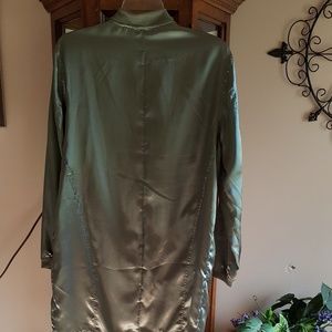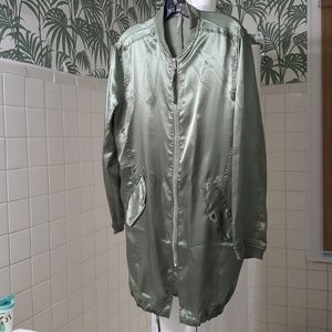 Trending utility jacket in pistachio color. Excellent pre-owned condition/Never Worn. Olive green sateen finish with ribbed collar & cuffs, a flattering drawstring hem & long sleeves. Fitted jacket has two snap waist pockets. Full-zip front makes this stylish jacket perfect for layering.