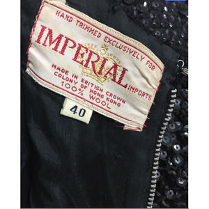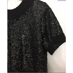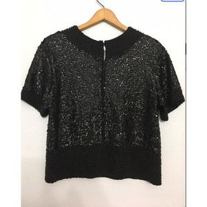 BEAUTIFUL black sequins and beaded blouse. Heavy and stunning! Total sequin style with 2.5" beaded collar, 2" beaded sleeves, and 4.5" beaded bottom, all with a geometric style to it. Black lining. Full zipper back with hook closure.