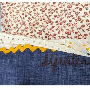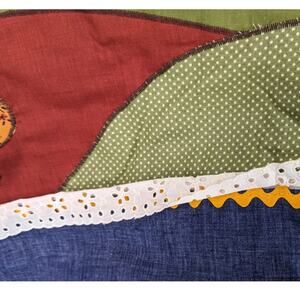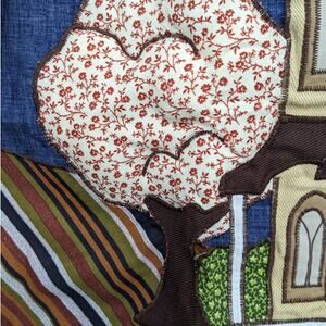 Handmade & signed by a skilled seamstress, it's appliqued with an awesome tall Gothic house with windows & chimney in rolling fields in earthy colors using stripes checks calico plain & polka dot fabrics. There's a puffy tree, a fence, butterflies & clouds (made out of eyelet lace fabric). Zigzag trim & eyelet lace on the bottom (turned up at the ends - see pics). Base fabric is a denim-look cotton (blend?).