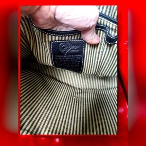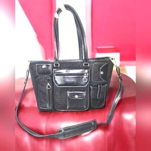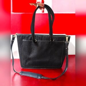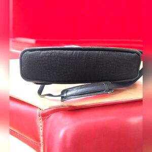 Vintage Brighton Briefcase Bag, black fabric with leather detail & straps, silver hardware. Measures 11"H x 17" W x 4-1/2" depth; an additional 10" handle drop, 25" strap drop, adjustable. Pre-loved, in good condition with some signs of wear at the base of the straps (last 2 pics), not visible from the outside of the bag. Lots of compartments & organization.