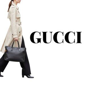 FANTASTIC, GUCCI Totissima Ophidia black calf leather tote / shoulder purse with "GUCCI" stamped on exterior hardware. Just GORGEOUS and in incredible condition especially considering it is a vintage Gucci. A rare find in this condition and 100% authentic, guaranteed. Made in Italy. Medium bag with top zippered close, will hold all your essentials, plus a tablet or laptop. Perfect for every day, travel, office, messenger bag or briefcase. Soft microfiber interior. This bag screams CLASS and LUXURY! Interior zip pocket. Leather in excellent condition except as otherwise *noted below. Will come with your CHOICE of ONE of the non-branded items in the last picture, 1. "Gucci" nameplate purse charm and bling ring; OR 2. bag liner; OR 3. Flora purse charm w/"G" initial.