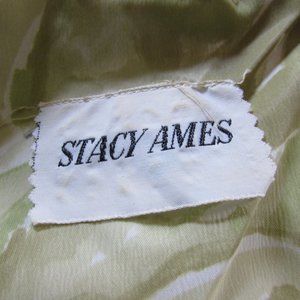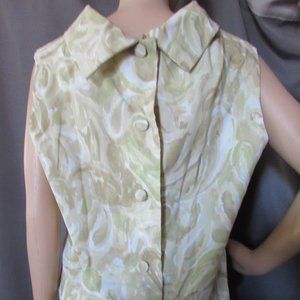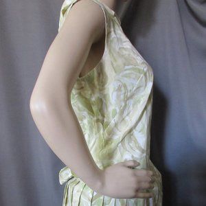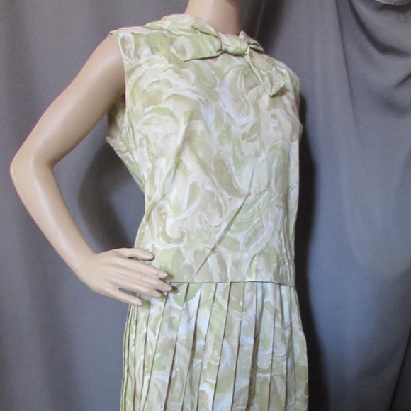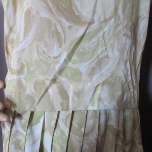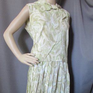 SALE Cool & Collected 1960 Era two-piece outfit. In sage and light parsley on white "smeared" floral lightweight crepe, it is perfect for the office or for luncheon. The sleeveless top is straight, loose shape with front cowl collar accented with a large bow. At the back, the collar is pointed and sits a little lower than the nape. It closes at the back with 5 self-fabric buttons. The skirt is accordion pleated with 7" side metal zipper and button. Stacy Ames designed this.