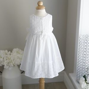 This crisp white cotton dress in size 18 months is the epitome of Summer! Such a timeless little garment that is so versatile. The cotton blend fabric is lightweight to keep your girl cool during warm months. The entire bodice is an embroidered eyelet fabric. The skirt is solid white and has a wide eyelet band at the bottom to mimic the bodice. A wide piping divides the bodice from the gathered skirt. A pre-tied white bow accents the left side of the waistline. Upper button back closure with 3 pearlized buttons. The dress is fully lined for modesty. Super cute summer dress for beach portraits, vacations, parties, church, weddings. Dress it up with ballet flats or dress it down with sandals. Bought new and newer wore. Perfect, Pristine condition.