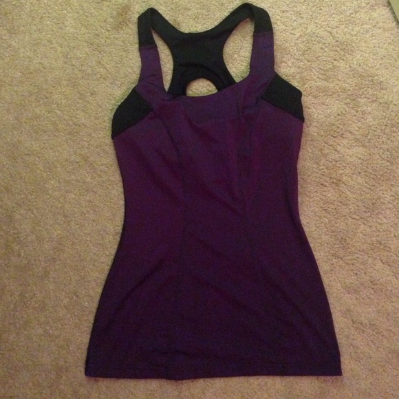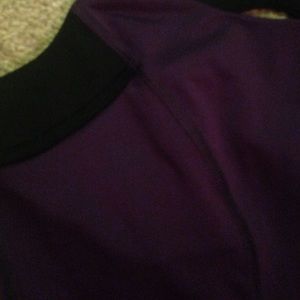 Purple and black. Form fitting and super silky soft. 92% polyester, 8% spandex. I've never worn it because it's too tight across my chest but it has been washed. It hugs your curves in a super flattering way with double stitching along front to create a nice look while keeping it snug against your body.