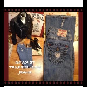 FABULOUS 25 WAIST "JOEY" DESTROYED STYLE TRUE RELIGION JEANS! SOFT, PRE WASHED DESTROYED FABRIC OF 100% COTTON-SOME STRETCH! Zipper with large button top closure! Low rise at 7" with a wider leg/BOOTCUT with a 32" inseam.. Actual measurements : waist flat 13.5"; hips flat at widest part about 17.5"... This brand tends to run small, so please, double check measurements :)