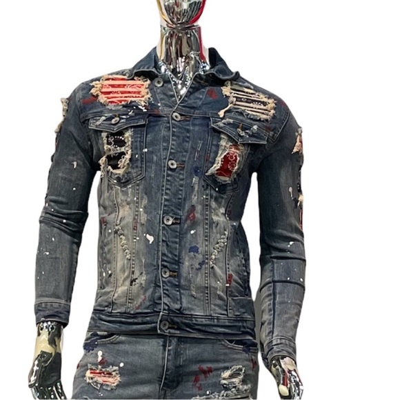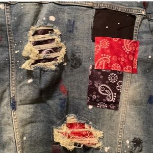 Streetwear, bandanna patchwork, painted distressed jeans. Goes great paired with the jacket listed.