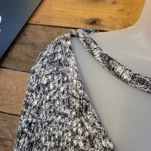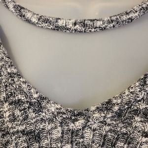 okay so we will start with the color. I feel like it's a midnight color. in some lights it looks black but in some lights I think the darker color has a blue tint to it. of course the other color is an off white. the neckline is a wide V neckline. there is a strap of knitted material across the top of the neckline. like a choker neckline or necklace. the sleeves are long approximately to the wrist and in some cases may go a little past the wrist. the sleeves start fitted but then slowly form to a bell ends. the reason for the bell is that there is a cut in the material at the end of the sleeves that shape into a V. this will allow the sleeves to drape on you. the hemline is known as a A style as the sides hang down lower on each side then the middle. the middle is where the crop part comes in. this is a knitted material so it will have a little stretch to it. it's not super heavy but does have a little weight to it. found no issues or flaws. smoke free home and pet friendly home.