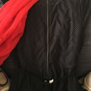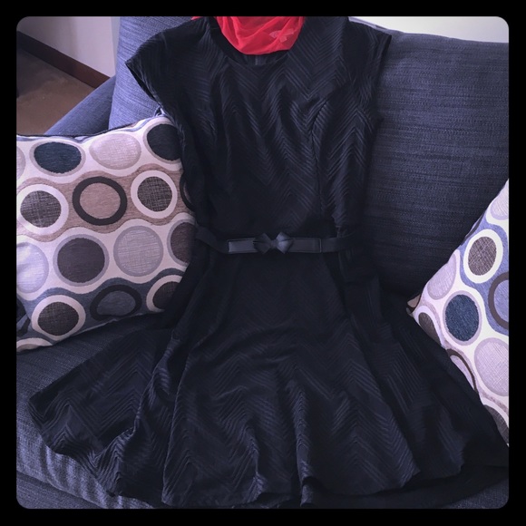 Classic example of the "classy" black dress, with a black on black zig zag pattern throughout. Zippers up the back. Comes with a dainty belt adorned with a very small Boeing the center, Very flattering on all body types. Fashioned from after some of the "Marilyn Monroe type dresses" she's more know for. Very comfortable. Wore w/a red contrasting scarf & black stilettos, however flats will look great too with this dress! Any questions please ask! Reasonable offers always welcome! Only worn 1x!!