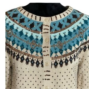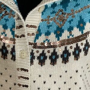 Great sweater for winter! Pretty colors with copper sequins scattered throughout. Nice weight to it. Measures 24 inches in length with a 18 inch sleeve. Looks great with denim and boots! Good condition!
