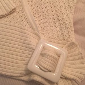 I love this sweater!!! It is in like new condition. Only worn a few times. "Buckle" at waist is such a unique detail. Form fitting but not tight this truly stands out when you wear it. *note*im selling this bc it doesn't fit across my chest properly. Probably wears more like a small (size 4-6)