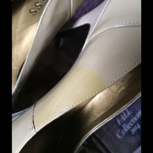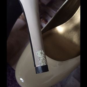 Never worn...few minor scuffs. Discoloration on shoe shown in pic 3. Damage on a small area of heel tip in pic 2. See pics for damages