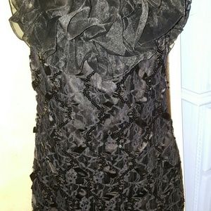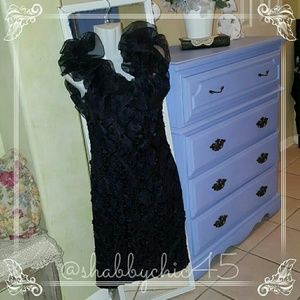 Beautiful lace, ribbon, sequin party dress is adorned with a lovely chiffon ruffled neck that can be worn on or off shoulders. It is fully lined and and reinforced to keep its shape. It comes down to mid thigh. Shoes are listed separately.