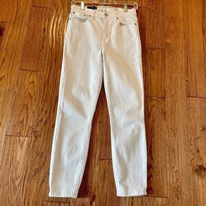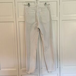 10” front rise with 14” waist and 25” cropped inseam: great stretch! Some color transfer on top of jeans and slight stretch in crotch not noticeable when on.