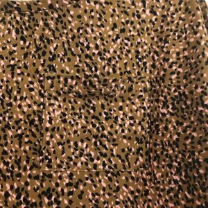 Sturdy soft fabric pullover with taupe background and pink speckled print. Would best fit a size small.