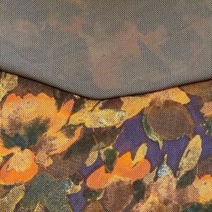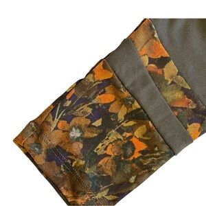 Contemporary print top with mesh detail. Stylish sage green accented with colors of orange. Made from a blend of nylon/spandex. Length measures 29 inches. Armpit to armpit measures 21 inches. Sleeve length measures 25 inches. Excellent preowned condition.