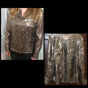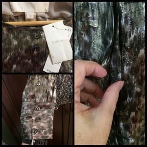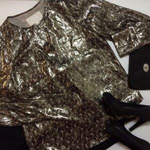 Silver, Gold and Black...32% Metallic and 69% Silk blend shear shirt with wide three button cuffs and hidden buttons down front. Two pockets and a button up high on each sleeve to roll and make shorter Size 12 NWT. Perfect for the Holidays!!! 💕 20.5" across chest laying flat and 26.5" in length...Bundle to Save more plus ⚡️📦📫😄💕 normally $120