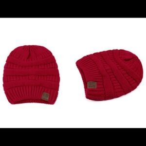 Adorable red knitted beanies with leather tags. Cozy, soft and warm.
