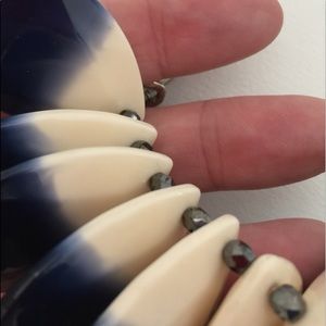 New high end designer Diana Broussard's bold Navaho Degrade necklace in Navy Blue and cream. This necklace is tribal feather inspired with hand painted drop shaped plexiglass on silver tone chain. Tip of feather is Navy then blue, then cream. Approx. 20" long w/2" extender. Hand made in Italy. STUNNING!