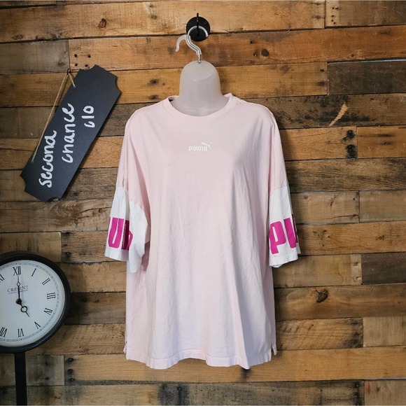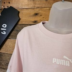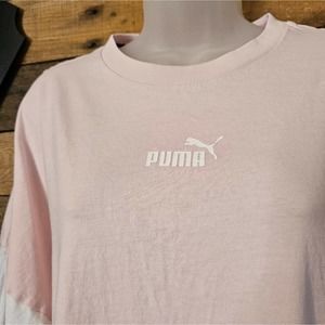 the main color is a light pale pink color. rounded crew neckline. you will see the puma brand logo under the neckline in the upper center part of the chest. this has short sleeves that are white. you will then see in a pink magenta color the brand name Puma on each sleeve. there are 2 inch slits on each side of the top at the hemline. on the back in the upper portion, you will see a sewing line. in the middle of this line and the back, you will see the puma tag hanging from that. found no issues or flaws. smoke-free home and pet friendly home.