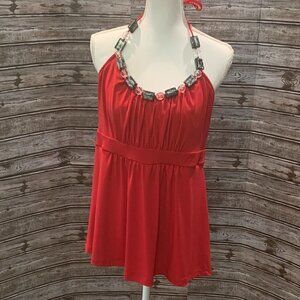 Stunning sleeveless red top with chunky beaded neck with a ribbon neck tie. Super stretchy.
