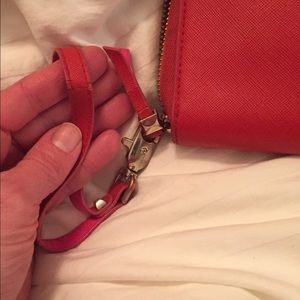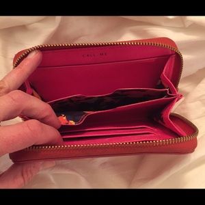 Perfect wallet/wristlet for those days when you're traveling light. Inner pocket fits your phone. Slots for credit cards change and cash. Even enough room for a lipgloss on top. Used condition but lots of life left. Wear on handle as shown in picture. Coral color with pink inside and navy and pink flower print.