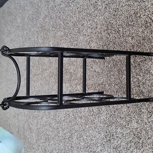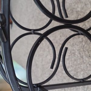 Black metal with few blemishes as seen in pictures. Holds 6 bottles. 16" tall at handle, 9 1/4" across, 5 1/4" depth. Great for compact spaces