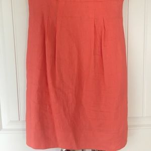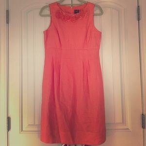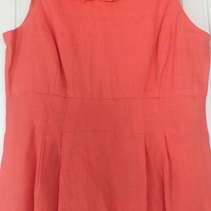 Women's Taylor orange linen above-knee sleeveless cocktail dress with a beautiful floral design on the collar. In excellent condition