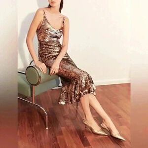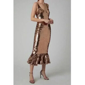 SALONI Aidan Bronze Sequin Flounce Hem Shimmering V-Neck Party Midi Dress Size 8