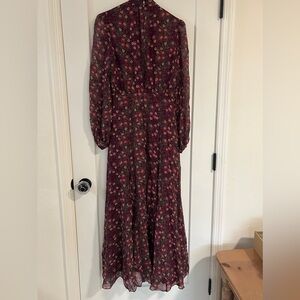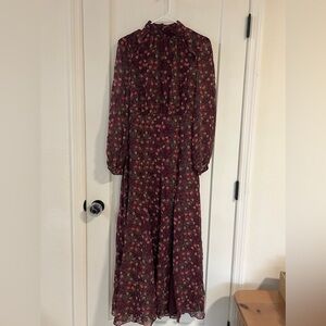 Red floral cotton (100% Silk). Lining (100% Polyester). A-line. Long sleeves. Mock neck. Back zipper closure.