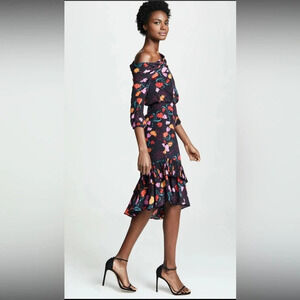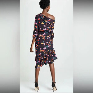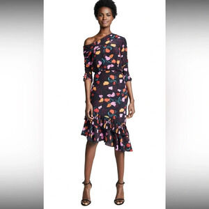 SALONI Azelea Floral Print LEXIE Asymmetric Off Shoulder Silk Midi Dress Size 2