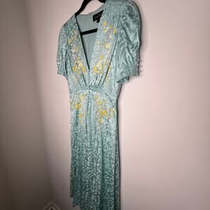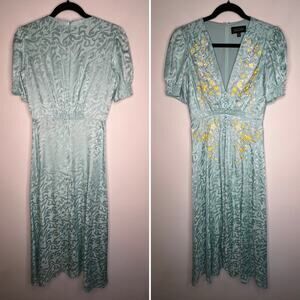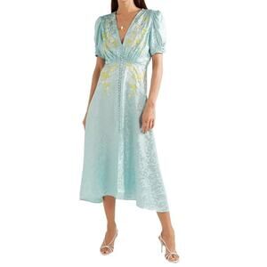 SALONI Blue Lea Shirred Silk Satin Jacquard Embroidered Midi Dress Size 2