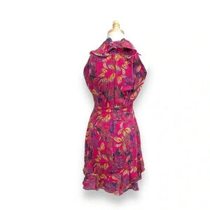 SALONI Cece 100% Silk Dark Pink Berry Printed Ruffle V Neck Mini Dress Size 6