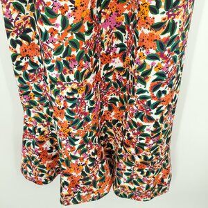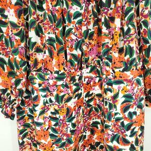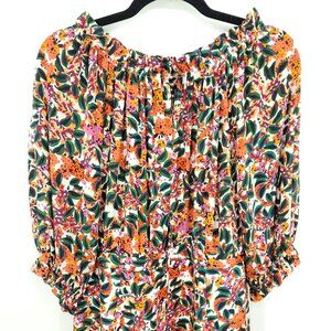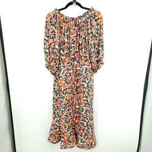 SALONI Floral Grace Silk Tea-Length Off the Shoulder Midi Dress 12 Multi Print, GUC with minimal wear, a pull at back as shown (see last photo).