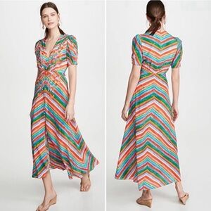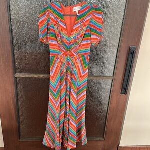 SALONI Lea Striped Silk Crepe Dress Rainbow Stripe Star Print Midi Size 12