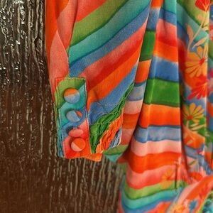 Multi striped cotton (100% Cotton). Hourglass. Short sleeves. V-neckline. Hidden back zipper closure. 50" from shoulder to hemline. Imported.
