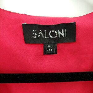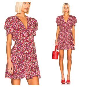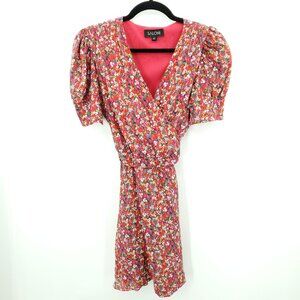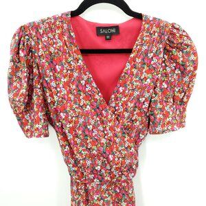 SALONI Lea Wrap Mini Dress 8 Red Poppyfield, good used condition with light wear, wear at sleeve cuffs as shown; no other flaws.