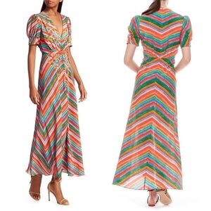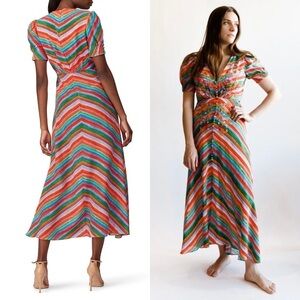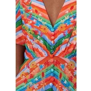 SALONI Silk Rainbow Floral Stripe Puffed Short Sleeve Button Front Midi Dress 4
