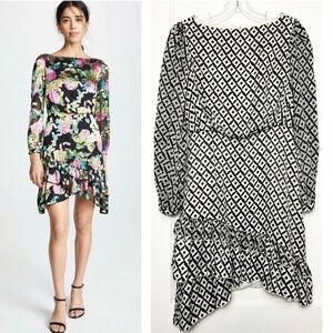 Equal parts fun and flirty, the Saloni Silk Boat Neck Ruffled Mini Dress can take you from happy hour to a romantic party for two. Made from ivory silk-blend chiffon and black velvet devore that’s elegantly patterned in a dainty geometric design. Tailored to be slightly loose at the bust and fitted at the waist, loose at the hip.
