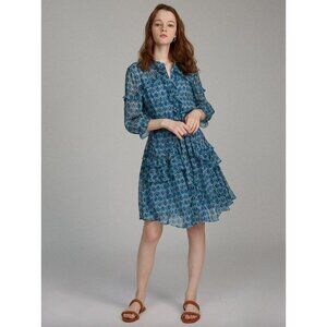 SALONI Tilly Silk Ruffle Belted Mini Dress Filigree Batik Blue Womens Size US 4