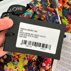 “Dare to be demure in Saloni’s“Tricia” silk-crepe dress, featuring shoulder-baring neckline with one mod thin strap, allover refined floral vine print, and a ruffled flounce hem hitting above knees.”