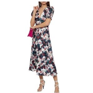 SALONI floral silk maxi dress with V-neck collar, buttons down front, slight smocking detail at sleeves, buttons at sleeves, slit at front, and hidden zipper at back.