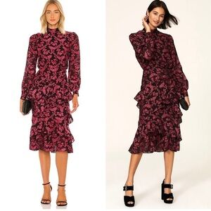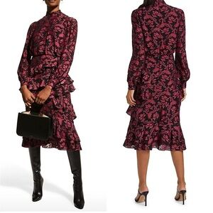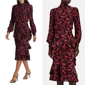 Black floral printed cotton (65% Rayon, 35% Silk). Lining (100% Polyester). Sheath. Mock neck. Long sleeves. Back zipper closure. 47.5” from shoulder to hemline.