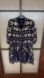Navy and gold silk (85% Silk, 15% Lurex). Shift. Three quarter sleeves. Crew neckline. Hidden front button down placket. 34" from shoulder to hemline. Imported.