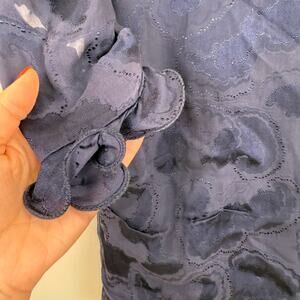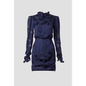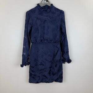 Blue jacquard satin (58% Rayon, 42% Silk). Lining (100% Polyester). A-line. Long sleeves. Crewneck. Back zipper closure. 34.5" from shoulder to hemline. Pit to pit 16”. Waist 27”. Sleeve length 25