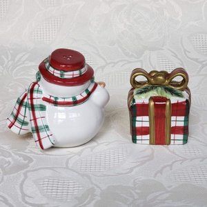 SALT & PEPPER Shaker ~~ Snowman and Gift, Fitz and Floyd Plaid Christmas