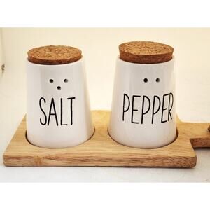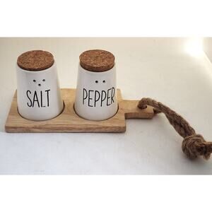 Unique set of salt & pepper shakers with a wood holding tray by Pier 1. These are white ceramic with "Salt" and "Pepper" written on each one respectively. The tops are made of cork that can be removed to fill. There is a wood board with round cutouts to hold the shakers. The wood board has a rope attached to it for additional detail. The shakers are about 3.5" tall. Very cute set for any table of buffet.