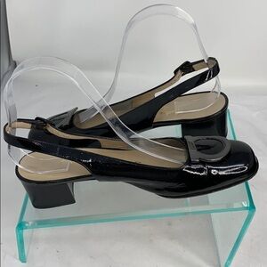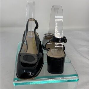 This is a beautiful pair of Salvatore Ferragamo Black Patent Leather Sling Back Shoes