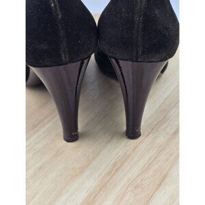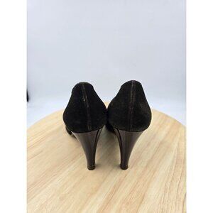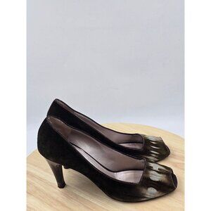 Pre-Owned SALVATORE FERRAGAMO Green Tie Dye Suede Open Peep Toe Pumps Heels Size 8 made in Italy comes with box is damaged. Flaws- some scratches on outsides- some wear on bottom soles an heels- doesnt have sz measures as sz 8 see pictures above.