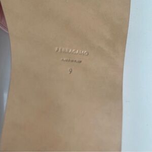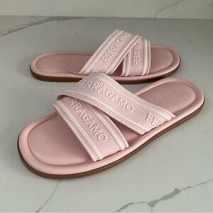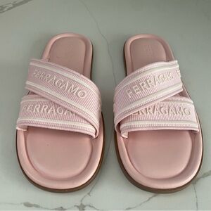 SALVATORE FERRAGAMO Slip On Slide Sandals Worn once Includes original box Size 9 Pink Ferragamo Ladies Sandals. Ferragamo Ladies Laurene Logo Slides. This stylish flat slide features two thick fabric straps, leather-lined, with an all-over tonal signature for a classic Ferragamo finish. The padded insole and flat 0.5 cm heel ensure extra comfort. Crafted with precision in Italy, these slides combine luxury and practicality. Made in Italy. Beautiful Condition